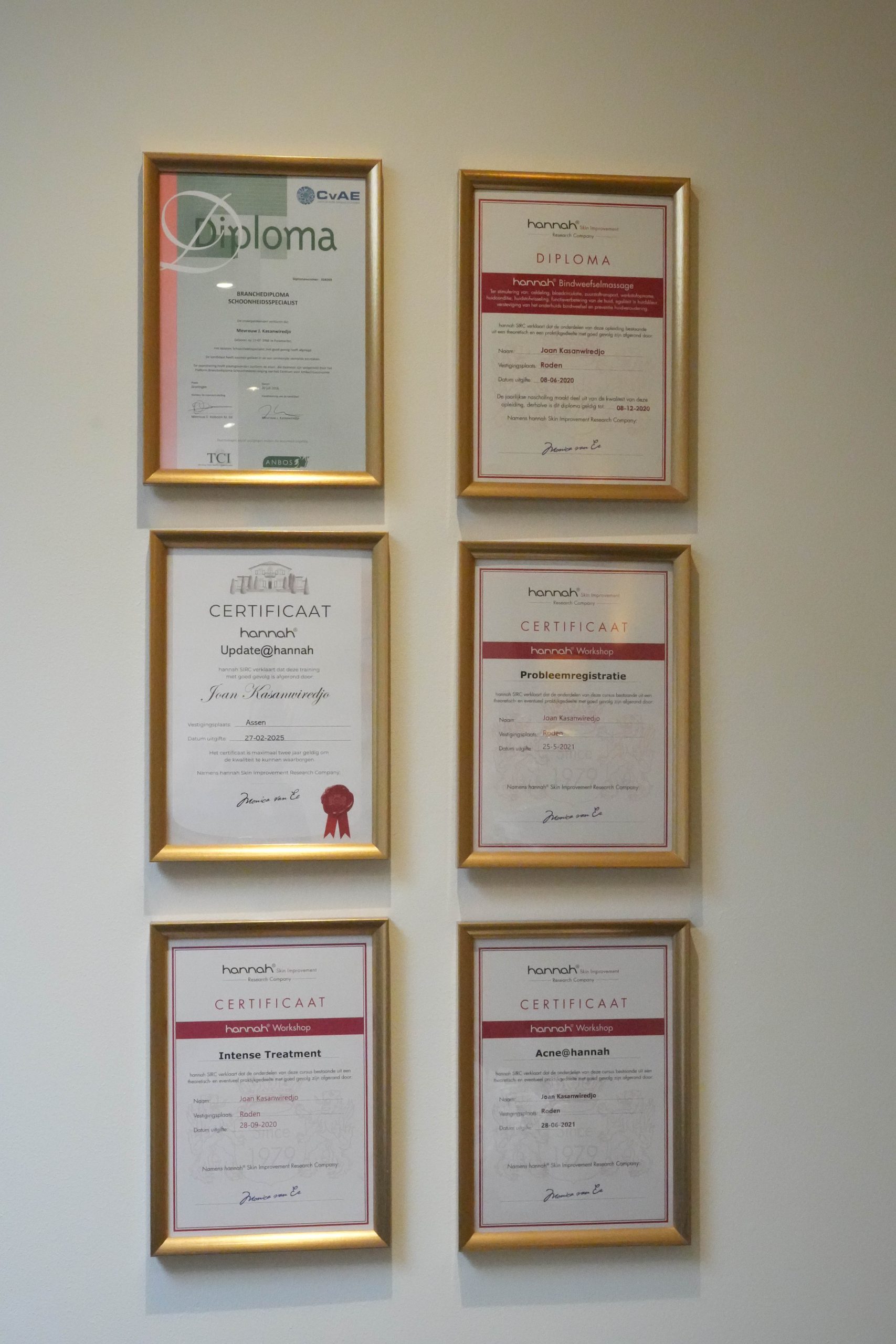 Op de foto zie je een verzameling van onze officiële hannah-diploma’s én het erkende diploma van gediplomeerd schoonheidsspecialiste. Deze certificeringen tonen niet alleen onze deskundigheid, maar onderstrepen ook dat wij een gecertificeerd en erkend hannah partner zijn. Voor jou betekent dit dat je verzekerd bent van professionele huidbehandelingen volgens de hoogste standaarden in huidverbetering.